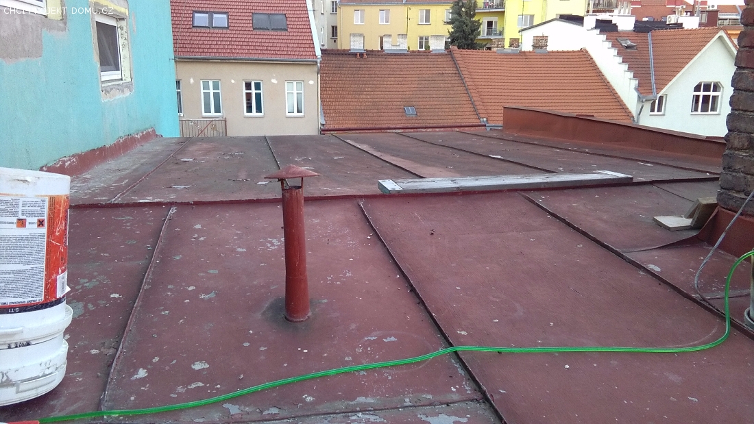 současný stav: Rovná plechová střecha s mírným spádem a dřevěnými krovy o rozměrech: 9,6m x 4,6m. viz foto.