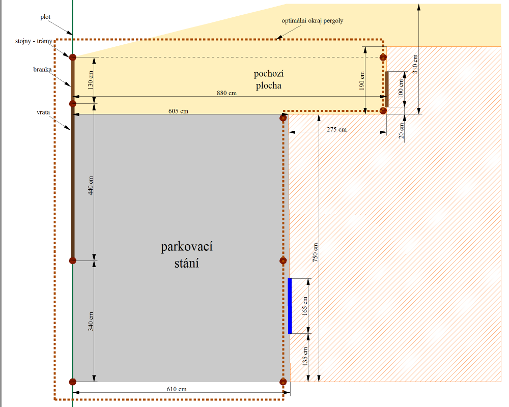 Jednoduchý nákres situace viz příloha. V nákresu je jediná nepřesnost - a to plánovaný přesah okraje (krytiny) pergoly přes plot do ulice. To mi stavební úřad jednoznačně zatrhl, takže krytina musí končit cca s vnější hranicí plotu. Nicméně vzhledem k tomu, že stojny - trámy budou tvořit součást nového plotu, nemohou být posunuty dovnitř pozemku a budou tedy muset být překryty jen velmi krátce.